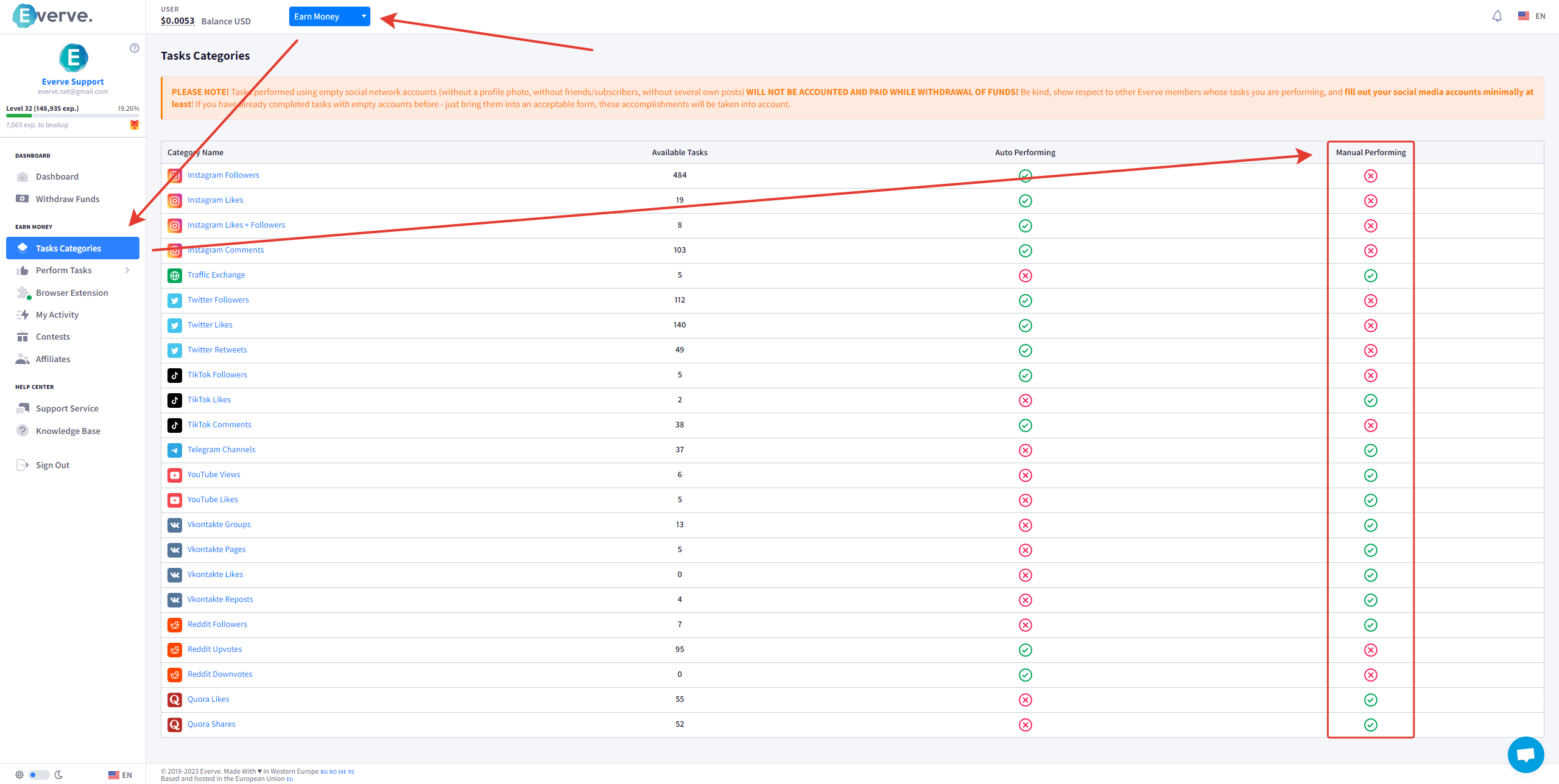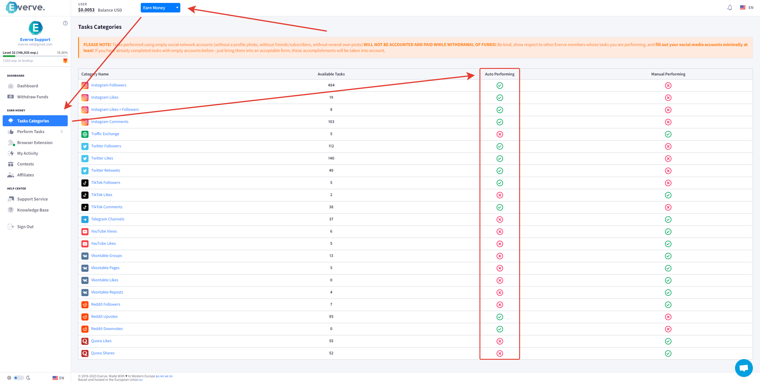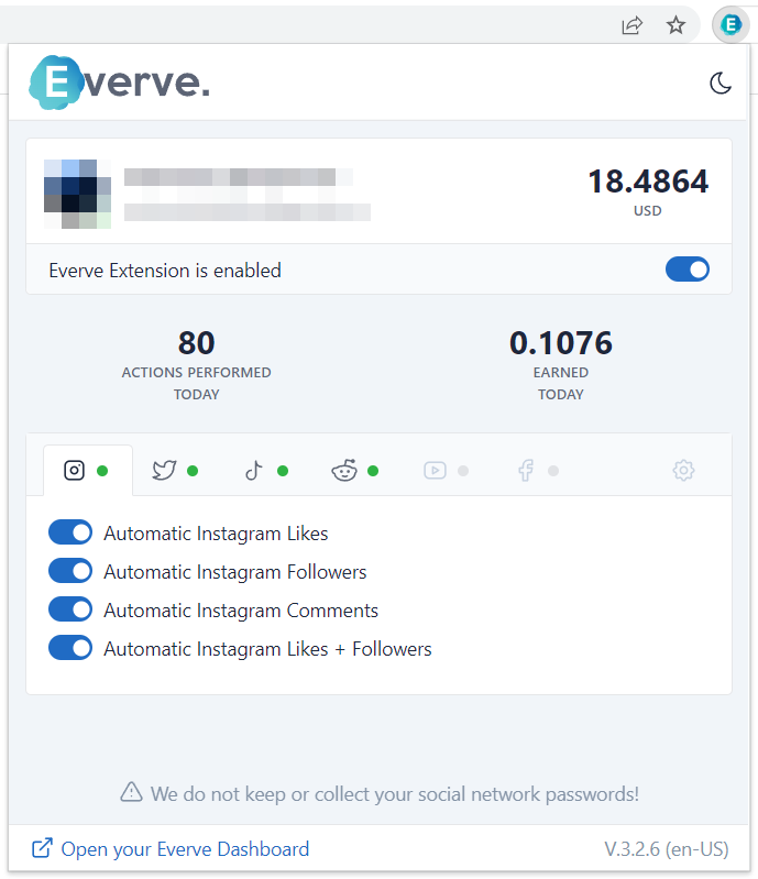 To perform tasks, install our extension in the browser, and also log in to the necessary social networks in the same browser. Detailed instructions for installing the extension can be found here: https://everve.net/user-kb/32/
