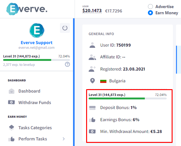 - Affiliate program: +1 experience point for every 10 tasks completed by referrals or for every 10 tasks that your referrals completed.